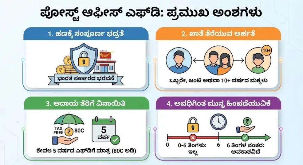 ನಿಮ್ಮ ಹತ್ತಿರದ ಅಂಚೆ ಕಚೇರಿಗೆ (Post Office) ಭೇಟಿ ನೀಡಿ ಆಧಾರ್ ಕಾರ್ಡ್, ಪ್ಯಾನ್ ಕಾರ್ಡ್ ಮತ್ತು ಫೋಟೋಗಳನ್ನು ಸಲ್ಲಿಸುವ ಮೂಲಕ ಸುಲಭವಾಗಿ ಎಫ್ಡಿ ಖಾತೆಯನ್ನು ಆರಂಭಿಸಬಹುದು. ಕನಿಷ್ಠ 1,000 ರೂಪಾಯಿಗಳಿಂದ ನೀವು ಹೂಡಿಕೆಯನ್ನು ಆರಂಭಿಸಬಹುದು.