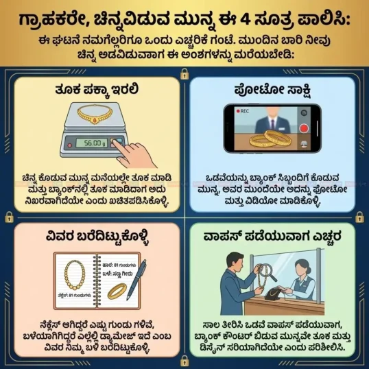 - ಫೋಟೋ ಸಾಕ್ಷಿ: ಒಡವೆಯನ್ನು ಬ್ಯಾಂಕ್ ಸಿಬ್ಬಂದಿಗೆ ಕೊಡುವ ಮುನ್ನ, ಅವರ ಮುಂದೆಯೇ ಅದನ್ನು ಫೋಟೋ ಮತ್ತು ವಿಡಿಯೋ ಮಾಡಿಕೊಳ್ಳಿ.