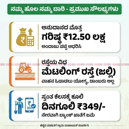 ಗ್ರಾಮೀಣ ಭಾಗದ ಕೃಷಿ ಚಟುವಟಿಕೆಗಳಿಗೆ ಉತ್ತೇಜನ ನೀಡುವ ನಿಟ್ಟಿನಲ್ಲಿ, ಗ್ರಾಮೀಣಾಭಿವೃದ್ಧಿ ಮತ್ತು ಪಂಚಾಯತ್ ರಾಜ್ ಇಲಾಖೆಯು ಮಹಾತ್ಮ ಗಾಂಧಿ ರಾಷ್ಟ್ರೀಯ ಗ್ರಾಮೀಣ ಉದ್ಯೋಗ ಖಾತರಿ (MGNREGA) ಯೋಜನೆಯ ಅಡಿಯಲ್ಲಿ ‘ನಮ್ಮ ಹೊಲ ನಮ್ಮ ದಾರಿ’ ಎಂಬ ಮಹತ್ವದ ಕಾರ್ಯಕ್ರಮವನ್ನು ಸರ್ಕಾರ ಅನುಷ್ಠಾನಗೊಳಿಸುತ್ತಿದೆ.