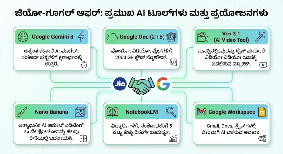 ಇದು ಕೇವಲ ಸ್ಟೋರೇಜ್ ಆಫರ್ ಅಲ್ಲ, ‘ಜೆಮಿನಿ 3’ (Gemini 3) ಮತ್ತು ‘ವಿಯೋ 3.1’ (Veo 3.1) ನಂತಹ ಅತ್ಯಂತ ದುಬಾರಿ ಟೂಲ್‌ಗಳನ್ನು ಉಚಿತವಾಗಿ ಬಳಸುವ ಸುವರ್ಣಾವಕಾಶ. ಇಂದೇ ಮೈಜಿಯೋ ಆ್ಯಪ್ ಚೆಕ್ ಮಾಡಿ!