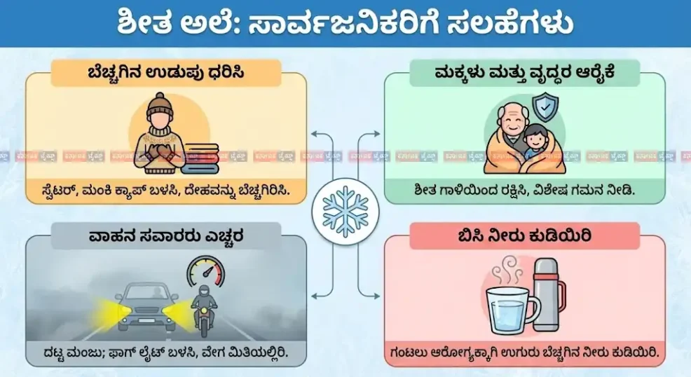 ಹವಾಮಾನ ಇಲಾಖೆಯು ನೀಡಿರುವ ಮಾಹಿತಿಯ ಪ್ರಕಾರ, ಮುಂದಿನ 5 ದಿನಗಳ ಕಾಲ (ಡಿಸೆಂಬರ್ 26 ರವರೆಗೆ) ಉತ್ತರ ಕರ್ನಾಟಕದ ಹಲವು ಜಿಲ್ಲೆಗಳಲ್ಲಿ ಶೀತ ಅಲೆ (Cold Wave) ಬೀಸುವ ಸಾಧ್ಯತೆಯಿದೆ. ಈ ಭಾಗದ ಕೆಲವೆಡೆ ಕನಿಷ್ಠ ತಾಪಮಾನವು 10 ಡಿಗ್ರಿ ಸೆಲ್ಸಿಯಸ್‌ಗಿಂತ ಕೆಳಗೆ ಕುಸಿಯುವ ಸಂಭವವಿದೆ.