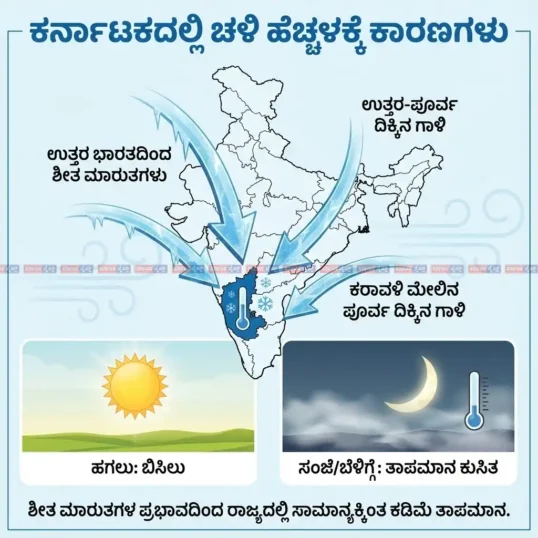 ಸಾಮಾನ್ಯವಾಗಿ ಡಿಸೆಂಬರ್ ಅಂತ್ಯದಲ್ಲಿ ಚಳಿ ಹೆಚ್ಚಾಗುವುದು ಸಹಜ. ಆದರೆ, ಈ ಬಾರಿ ಉತ್ತರ ಭಾರತದಿಂದ ಬೀಸುತ್ತಿರುವ ಶೀತ ಮಾರುತಗಳ ಪ್ರಭಾವದಿಂದಾಗಿ ಕರ್ನಾಟಕದ ಉತ್ತರ ಒಳನಾಡಿನಲ್ಲಿ ಸಾಮಾನ್ಯಕ್ಕಿಂತ ಕಡಿಮೆ ತಾಪಮಾನ ದಾಖಲಾಗುತ್ತಿದೆ. ಹವಾಮಾನ ಇಲಾಖೆಯ ವರದಿಯ ಪ್ರಕಾರ, ಉತ್ತರ-ಪೂರ್ವ ದಿಕ್ಕಿನಿಂದ ಬೀಸುತ್ತಿರುವ ಗಾಳಿ ಮತ್ತು ಕರಾವಳಿಯ ಮೇಲೆ ಬೀಸುತ್ತಿರುವ ಪೂರ್ವ ದಿಕ್ಕಿನ ಗಾಳಿಯು ರಾಜ್ಯದ ತಾಪಮಾನದ ಮೇಲೆ ಪರಿಣಾಮ ಬೀರುತ್ತಿದೆ. ಇದರಿಂದಾಗಿ ಹಗಲು ಹೊತ್ತಿನಲ್ಲಿ ಬಿಸಿಲು ಇದ್ದರೂ, ಸಂಜೆ ಮತ್ತು ಬೆಳಗಿನ ಜಾವ ತಾಪಮಾನ ಕನಿಷ್ಠ ಮಟ್ಟಕ್ಕೆ ಕುಸಿಯುತ್ತಿದೆ.